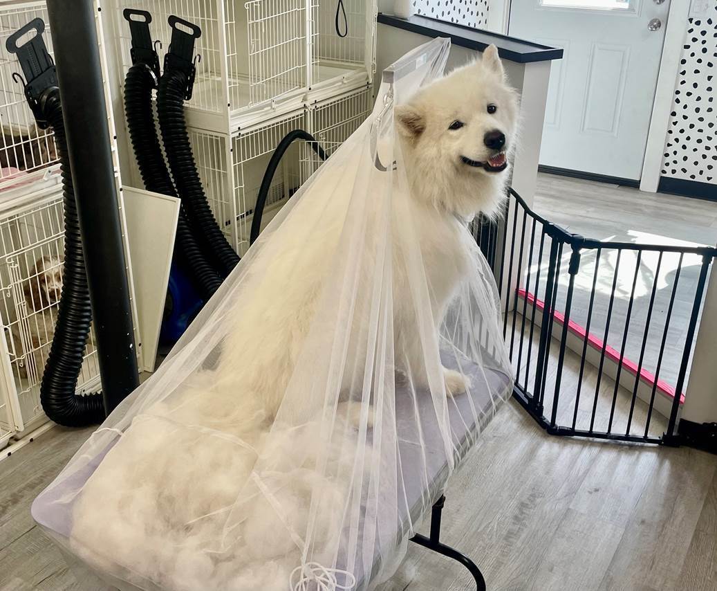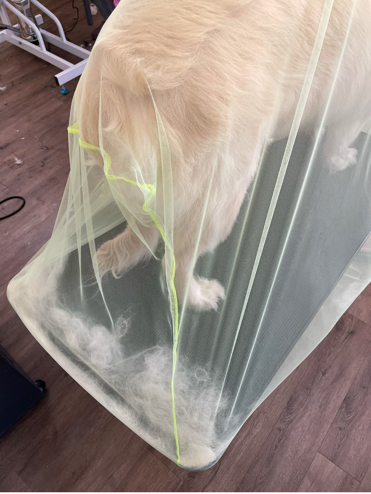 8.) Blow out as usual. Once dog is deshedded take net off and sweep off piles of hair. Finish drying dogs up tucks, legs, neck and other damp areas.