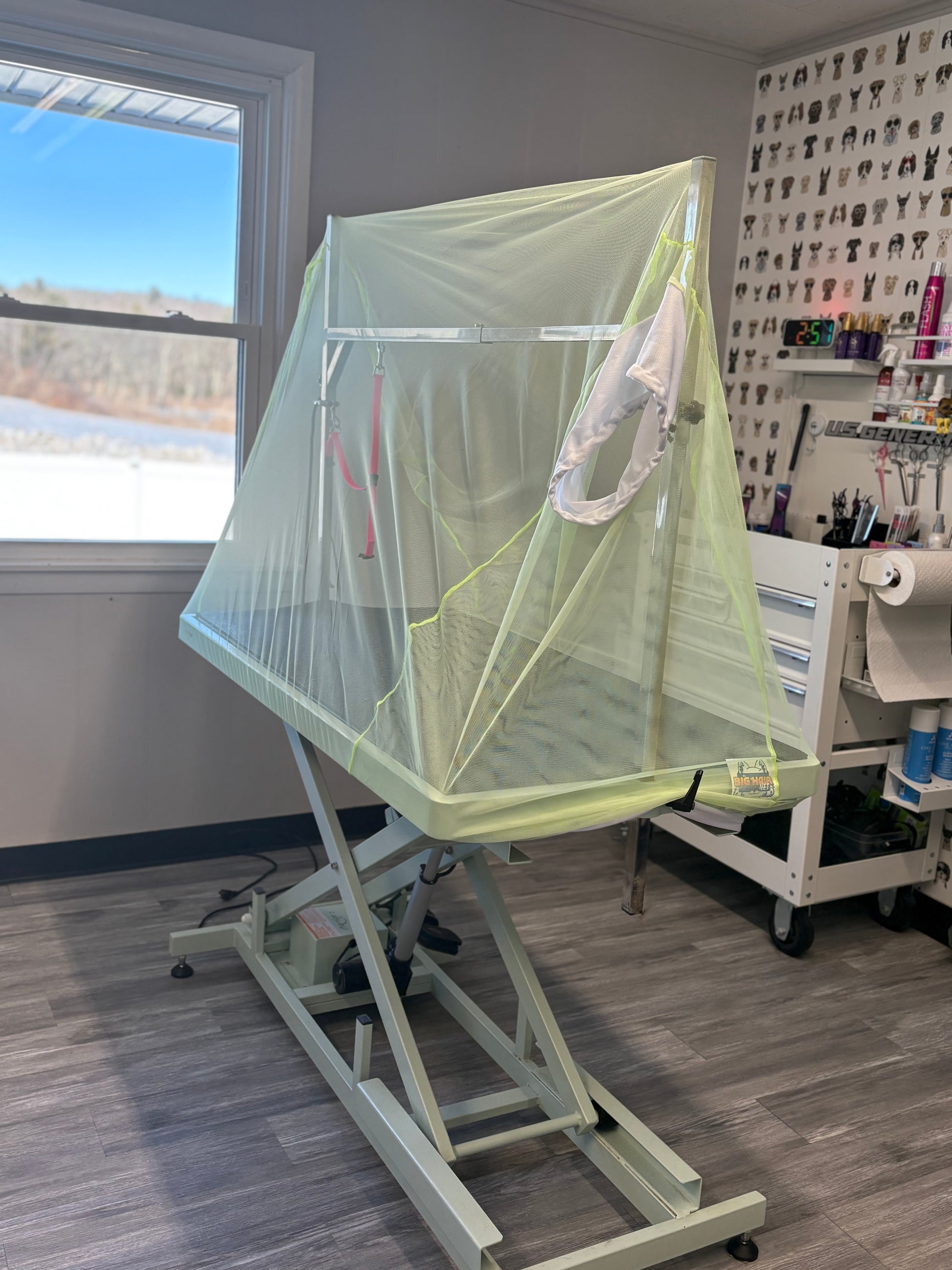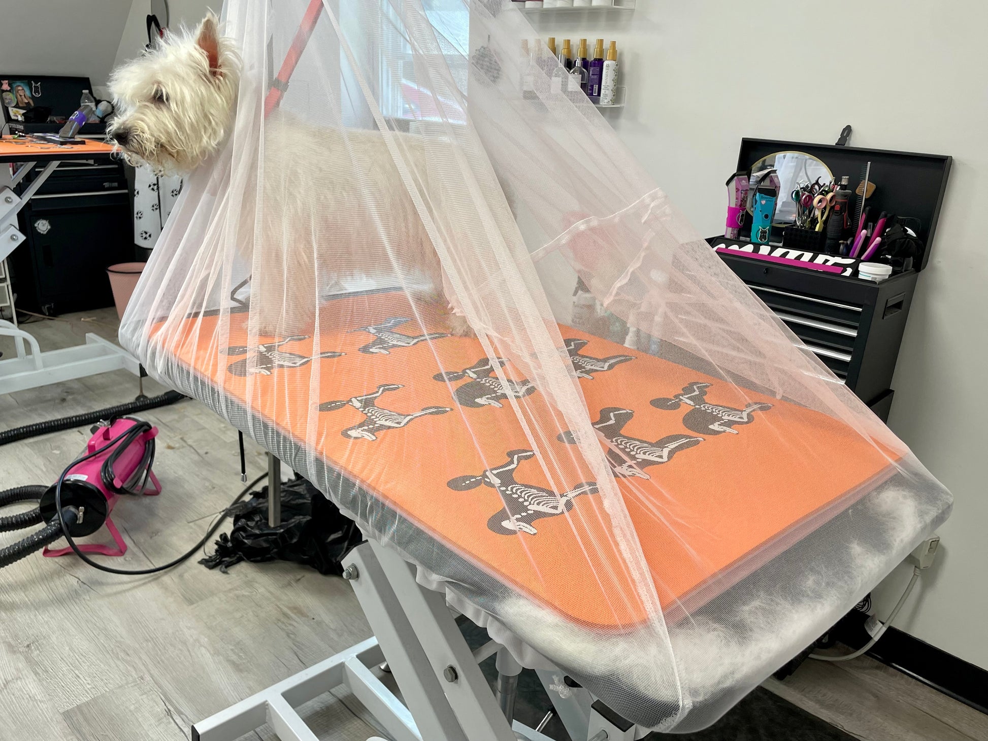 4.) Place the net with the face hole facing forward over the table and over the grooming arm. The arm creates a structure for net.